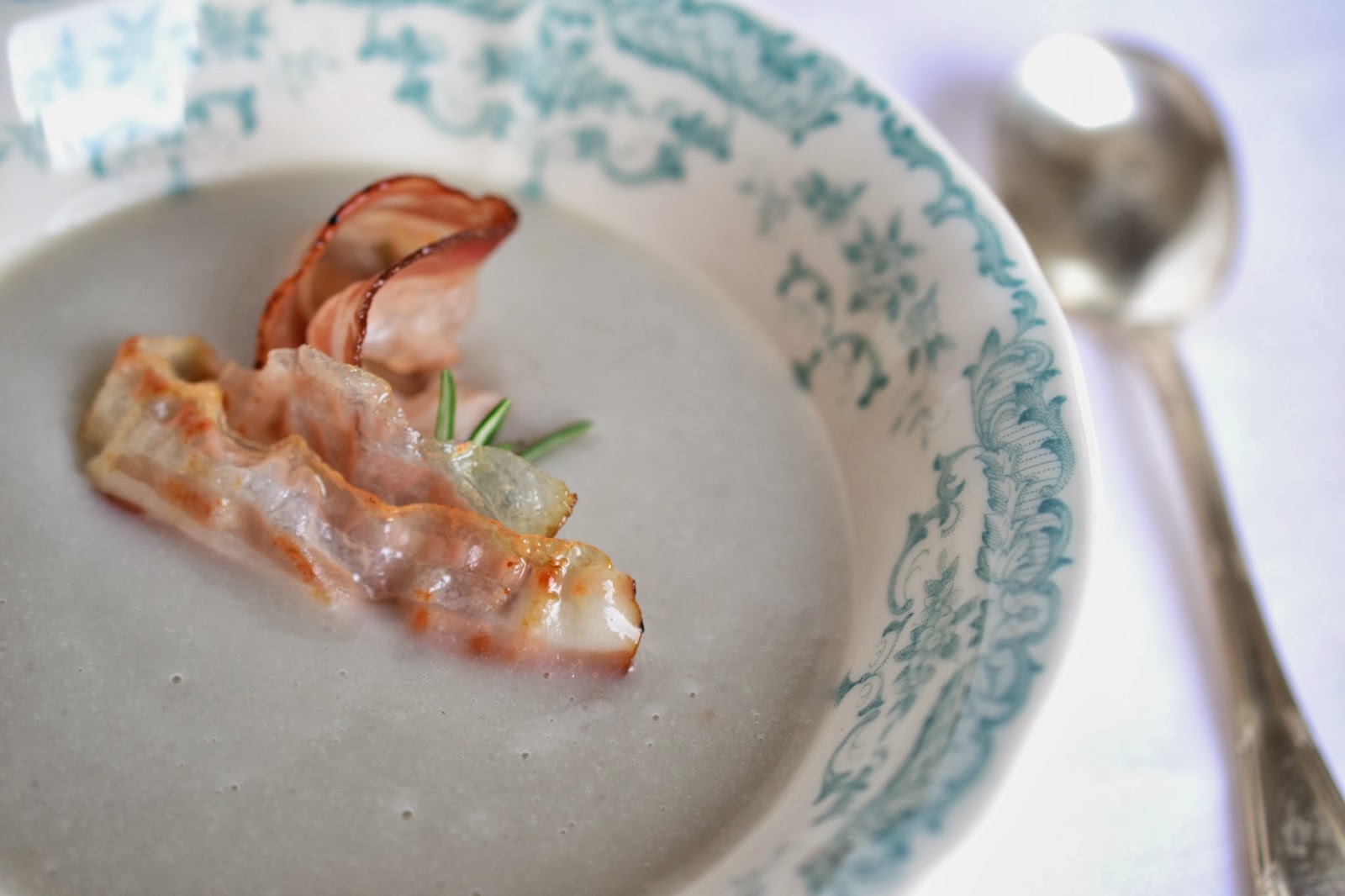 Con le foto non sono riuscita a migliorare la situazione: la luce non voleva saperne di collaborare e mentre cercavo di catturare lo scatto migliore, quattro occhietti vivaci mi imploravano di mollare tutto e di assecondare i loro desideri. Ho strappato velocemente questi scatti al pomeriggio piovoso e mentre ne valutavo gli esiti mi ripromettevo che non li avrei mai postati! Poi… alla sera, ormai rassegnata, ho messo in tavola la vellutata sbiadita arricchita da due fette arrostite di pancetta affumicata.
